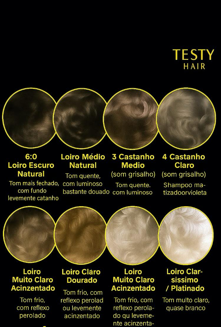 A tabela de cores é essencial para garantir a harmonia e naturalidade dos apliques e próteses capilares. Nesta página, apresentamos uma imagem detalhada que facilita a escolha do tom ideal, adaptando-se perfeitamente ao seu estilo e tom de pele.